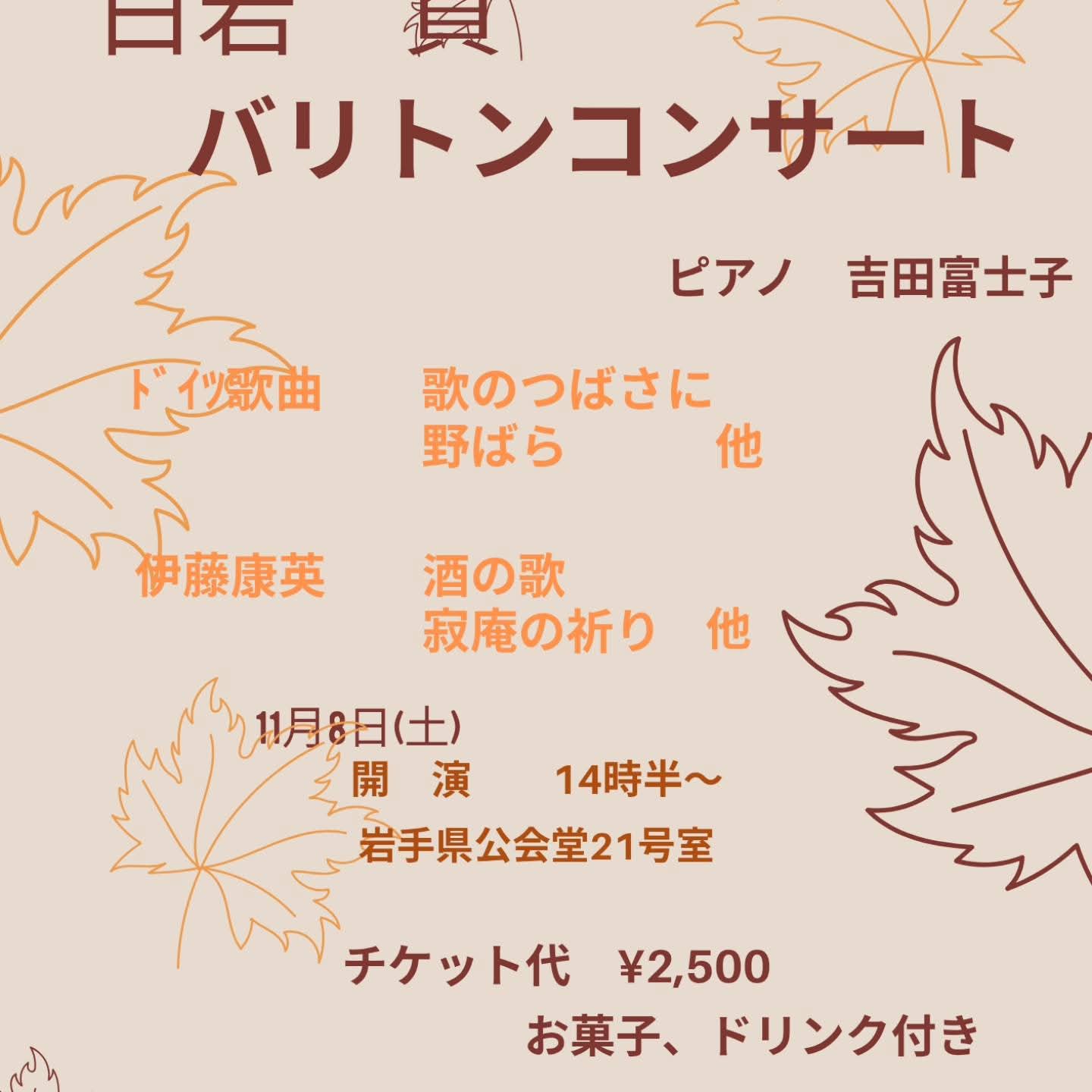 さて、これからは11月盛岡、12月は青森第九、1月6日は東京文化会館でのリート演奏、と続きます。盛岡は今年で3年目となる、大学の同級生、吉田富士子さんとのミニコンサート。彼女のお教室や関係者との会に続いて、名曲を歌います。昨年は風邪をこじらせてしまい、酷い声でやっとの思いで歌った悪夢があるので、今年はリベンジです(笑)。歌うたびに好評の「春風〜スカート」も津軽弁の朗読付きで歌います。僕にとって初の県外での演奏。さて、どうなるか!?そして年が明けて1月6日には東京文化会館でヴォルフを5曲ほど歌います。これはドイツで共に学んだ仲間たちとのコンサートで、我々の師である白井光子先生への感謝の思いを込めて企画した演奏会です。本当はもっと沢山の仲間に声を掛けたかったのですが、発表会的になるのは避けたい、との思いから全国各地での大学で教鞭を執る仲間たちとの会としました。同じ時期に学んだ梅本さんは今や国立音楽大学の学長。他に戦友のような、今でも家族ぐるみのお付き合いの藤村さん、優秀な後輩の浅井君と藤井さん、尊敬する先輩、長島さんとステージを共にします。東京文化で歌えるチャンスはそうそうないもの。近いうち改装工事となって使えない期間が長くなるようなので、東京文化会館小ホールで歌えるのは最後かな、と思っています。沢山のお客様においでいただきたいと思っています。