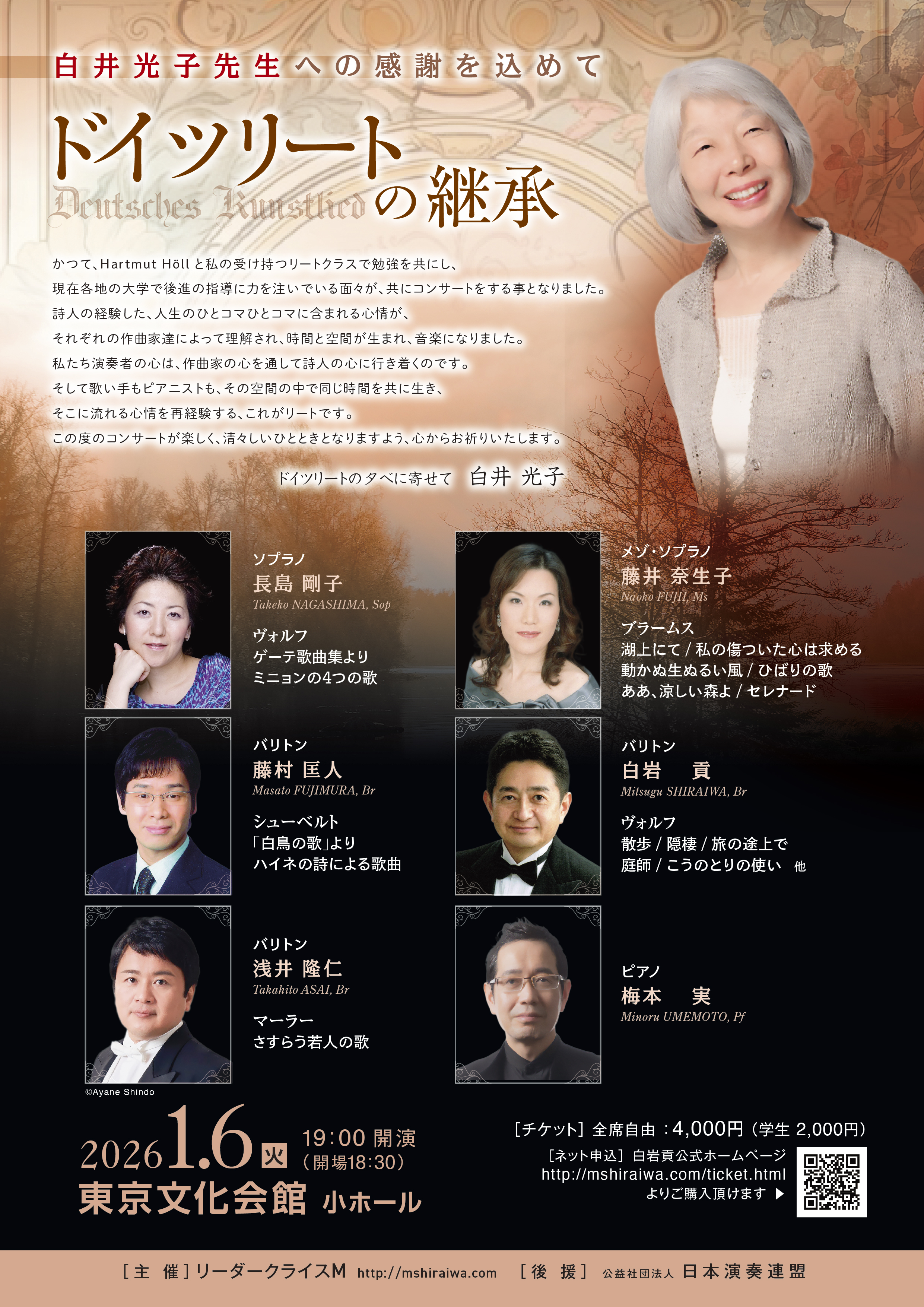 さて、これからは11月盛岡、12月は青森第九、1月6日は東京文化会館でのリート演奏、と続きます。盛岡は今年で3年目となる、大学の同級生、吉田富士子さんとのミニコンサート。彼女のお教室や関係者との会に続いて、名曲を歌います。昨年は風邪をこじらせてしまい、酷い声でやっとの思いで歌った悪夢があるので、今年はリベンジです(笑)。歌うたびに好評の「春風〜スカート」も津軽弁の朗読付きで歌います。僕にとって初の県外での演奏。さて、どうなるか!?そして年が明けて1月6日には東京文化会館でヴォルフを5曲ほど歌います。これはドイツで共に学んだ仲間たちとのコンサートで、我々の師である白井光子先生への感謝の思いを込めて企画した演奏会です。本当はもっと沢山の仲間に声を掛けたかったのですが、発表会的になるのは避けたい、との思いから全国各地での大学で教鞭を執る仲間たちとの会としました。同じ時期に学んだ梅本さんは今や国立音楽大学の学長。他に戦友のような、今でも家族ぐるみのお付き合いの藤村さん、優秀な後輩の浅井君と藤井さん、尊敬する先輩、長島さんとステージを共にします。東京文化で歌えるチャンスはそうそうないもの。近いうち改装工事となって使えない期間が長くなるようなので、東京文化会館小ホールで歌えるのは最後かな、と思っています。沢山のお客様においでいただきたいと思っています。